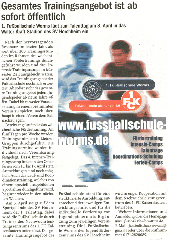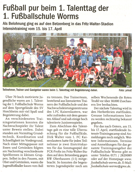 1. Fußballschule Worms lädt zum Talenttag am 3. April in das Walter-Kraft-Stadion