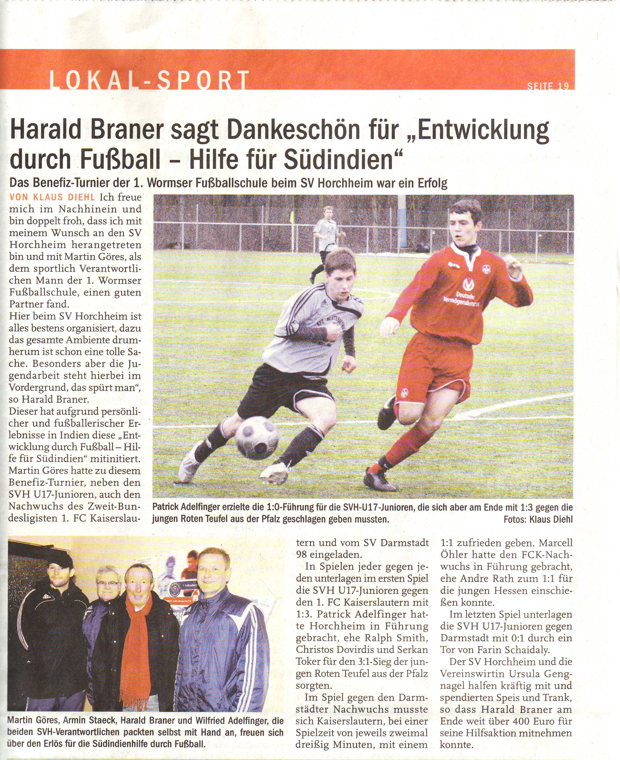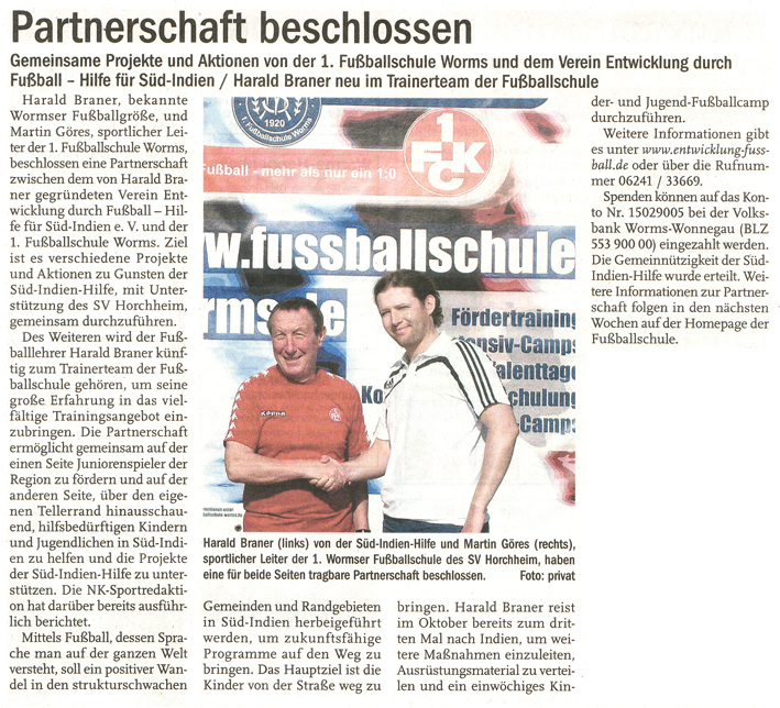 Harald Braner, bekannte Wormser Fußballgröße, und Martin Göres, sportlicher Leiter der 1. Fußballschule Worms, beschlossen eine Partnerschft zwischen dem von Harald Braner gegründeten Verein Entwicklung durch Fußball - Hilfe für Süd-Indien e.V. und der 1. Fußballschule Worms...