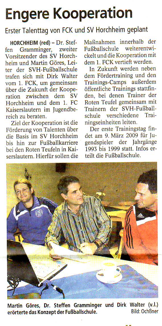 Dr. Steffen Gramminger, zweiter Vorsitzender des SV Horchheim und Martin Göres, Leiter der SVH-Fußballschule trafen sich mit Dirk Walter vom 1. FCK, um gemeinsam über die Zukunft der Kooperation zwischen dem SV Horchheim und dem 1. FC Kaiserslautern im Jugendbereich zu beraten.